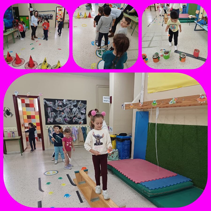 - Psicomotricidad: las propuestas incluyeron “escobas de bruja” para trasladar pelotas, un juego de equilibrio con sombreros de bruja para lanzar aros y un juego de adivinanzas para vestir a un esqueleto.