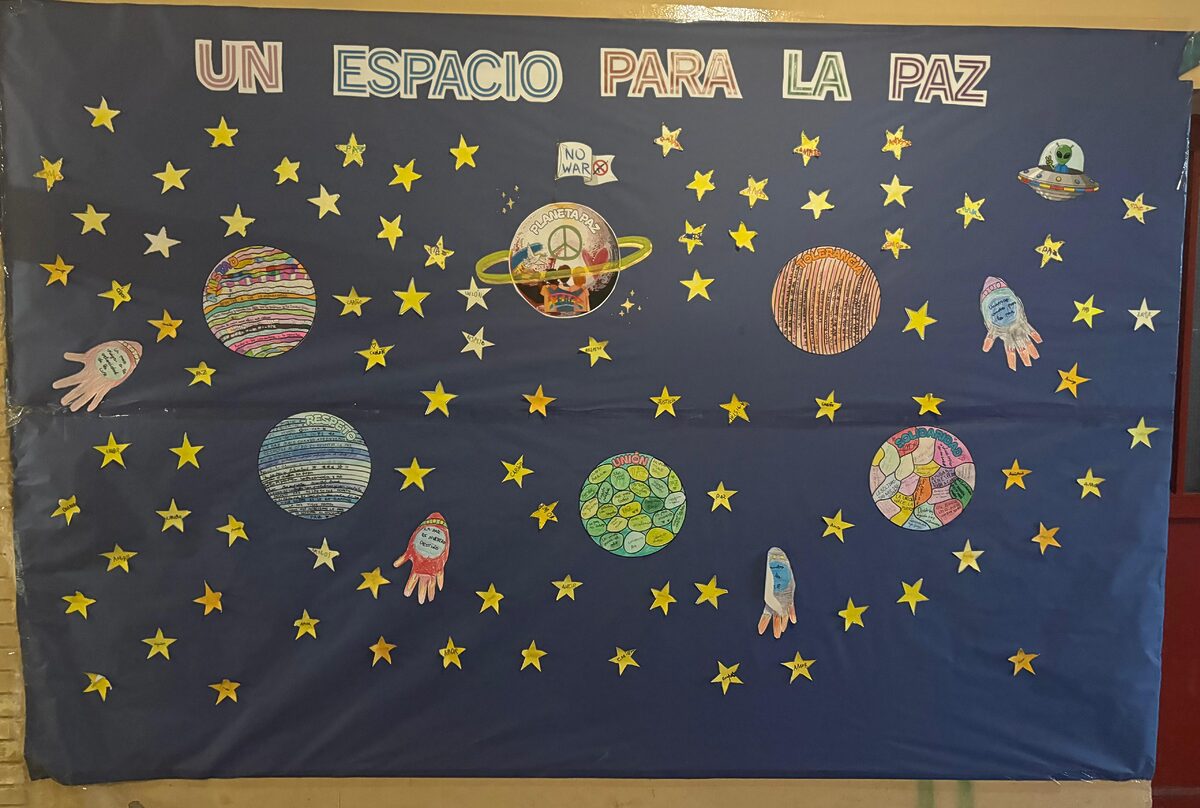 Elaboración del mural colaborativo “Un espacio para la Paz”, formado por planetas, estrellas y naves con mensajes de paz que rodean el Planeta de la Paz.